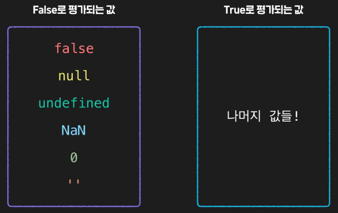 여기서 False로 평가되는 값은 Falsy, True로 평가되는 값은 Truthy라고 불리며, 빈 배열과 빈 객체인 [], {}는 Truthy 취급을 받는다. 만약 falsy와 truthy값을 명확하게 확인하고 싶다면 Boolean 함수를 사용해서 직접 boolean 타입으로 형 변환 해볼 수도 있다.
